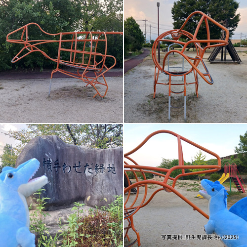 野球ができる広いグラウンドがある公園。ここの遊具にステゴサウルス型のジャングルジムがあります。