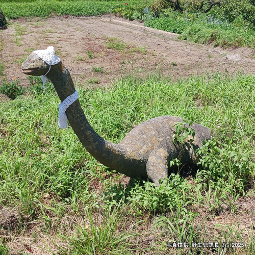 ◆ 吾妻川沿いの運動施設とあづま親水公園との間あたりの畑に手作りの首が長〜い恐竜がいた!(2025/11/26)