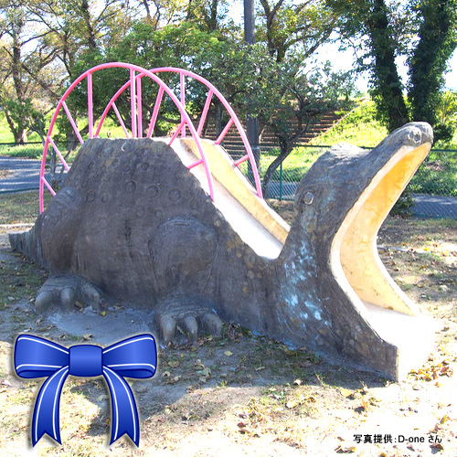広くて遊具もたくさんあり、桜の名所としても人気の公園にティラノサウルス型のジャングルジムがあります。