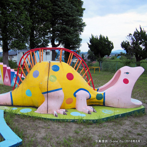 広々とした芝生のグラウンドにかわいいアニメチックな恐竜像が点在しています。紹介記事の写真には恐竜像が5体ありますね。