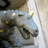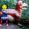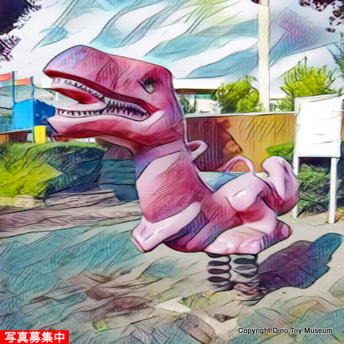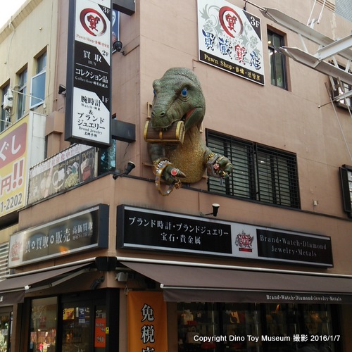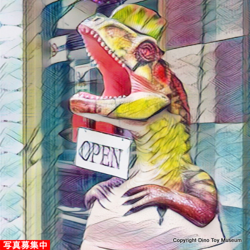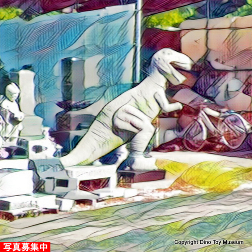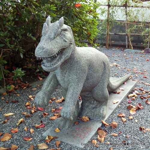 石材店の在庫が並ぶなかに、ソフビおもちゃのようなデザインの大きなティラノサウルス石像があります。お店の守り神? 酒場ダイナソーの近くだなぁ・・・ maimaiさんから情報をいただきました。