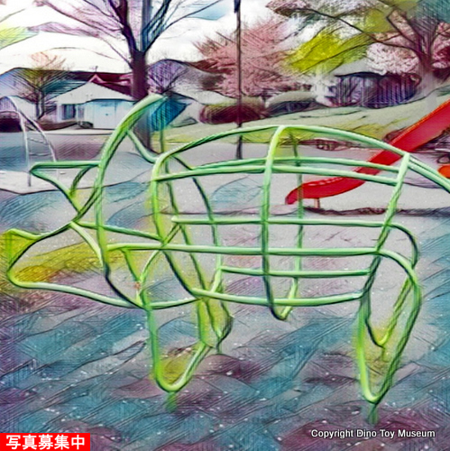 こどもの国の「せせらぎ」コーナーの近くにパイプでできたトリケラトプスとステゴサウルスの形をしたジャングルジムがあります。館長もこどもの頃、こどもの国に何回か行ったことがありますよ。