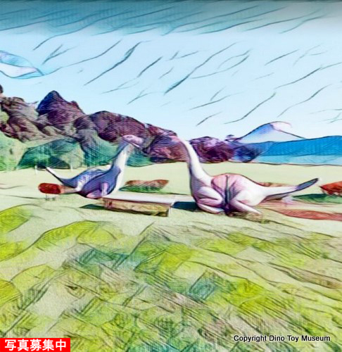 1975(昭和50)年4月に桜島自然公園として開設し、その後、1984(昭和59)年7月22日に恐竜模型設置により桜島自然恐竜公園に改名=恐竜の誕生日と判明、恐竜たちのメーカーについては記録が見つかりませんでしたが、作品の姿からみて日東商事の作品と思います。