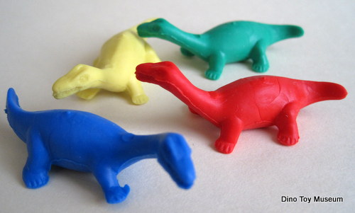 ![]() よいこのオモチャ「アーク」のノトサウルスです。ノトサウルスは全長1〜4m、「見せ掛けの爬虫類」という意味の学名がついた海に住んでいた絶滅した爬虫類で「偽竜」とも呼ばれています。館長が小さかった頃の恐竜図鑑には必ず載っていたメジャーな古生物でしたが、最近はあまり人気はないのでは。全体は首長竜みたいだけど、手足は完全なヒレには進化していないので、上陸できたのではないかとも考えられています。館長が買ったこのおもちゃは、駄菓子屋のデッドストックとしてヤフオクで出品されていたもの。消しゴム恐竜のような小さな恐竜オモチャがビニール袋にミニ恐竜が101体入って100円でした。「アーク」というソフビ玩具を作っていたおもちゃメーカーのようですが、意外にレアな貴重品だったのかも? その中のノトサウルスです。レトロでチープな感じがいいですね。ノトサウルスも4色集まって写真をパチリ!
