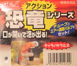 ![]() GEXアクション恐竜・アクション恐竜シリーズは「エアの力で恐竜が動く!迫力の中にかわいさをプラスした、見ていて楽しいアクセサリーです。水槽によみがえる恐竜世界!」という熱帯魚などを飼う時に、水中に酸素を送るため空気をボコボコ送りますよね。その時の空気の出口となるアクセサリーが恐竜の姿をしているシリーズだったんです。空気がたまるとティラノサウルスの口がパカンと開いて、空気がボコボコ出るんですね。写真の背中に棒が出ているのが見えますか? ここにチューブを空気ポンプにつないで、空気を送るんですね。恐竜を水槽のアクセサリーにするというアイデアも斬新ですが、ディフォルメされた感じもなかなか良いです。