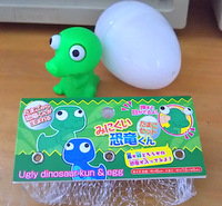 ![]() 100均のお店キャンドゥで見つけた恐竜おもちゃ「みにくい恐竜くん」。卵型の白いカプセルに入っていて、緑と青の2色のうちのどちらかが出てくる! 体をつまむと目が飛び出る!?なんだか良く分からない説明でしたが、買いそびれないように一つゲット! 家で開けてみたら緑色。ボディは恐竜と言うよりもワニ? 確かに体をつまんだら、目が飛び出ました。う〜ん、どこが面白いのか良く分からないなぁ。買うのは一つにしておいて良かった・・・。 |